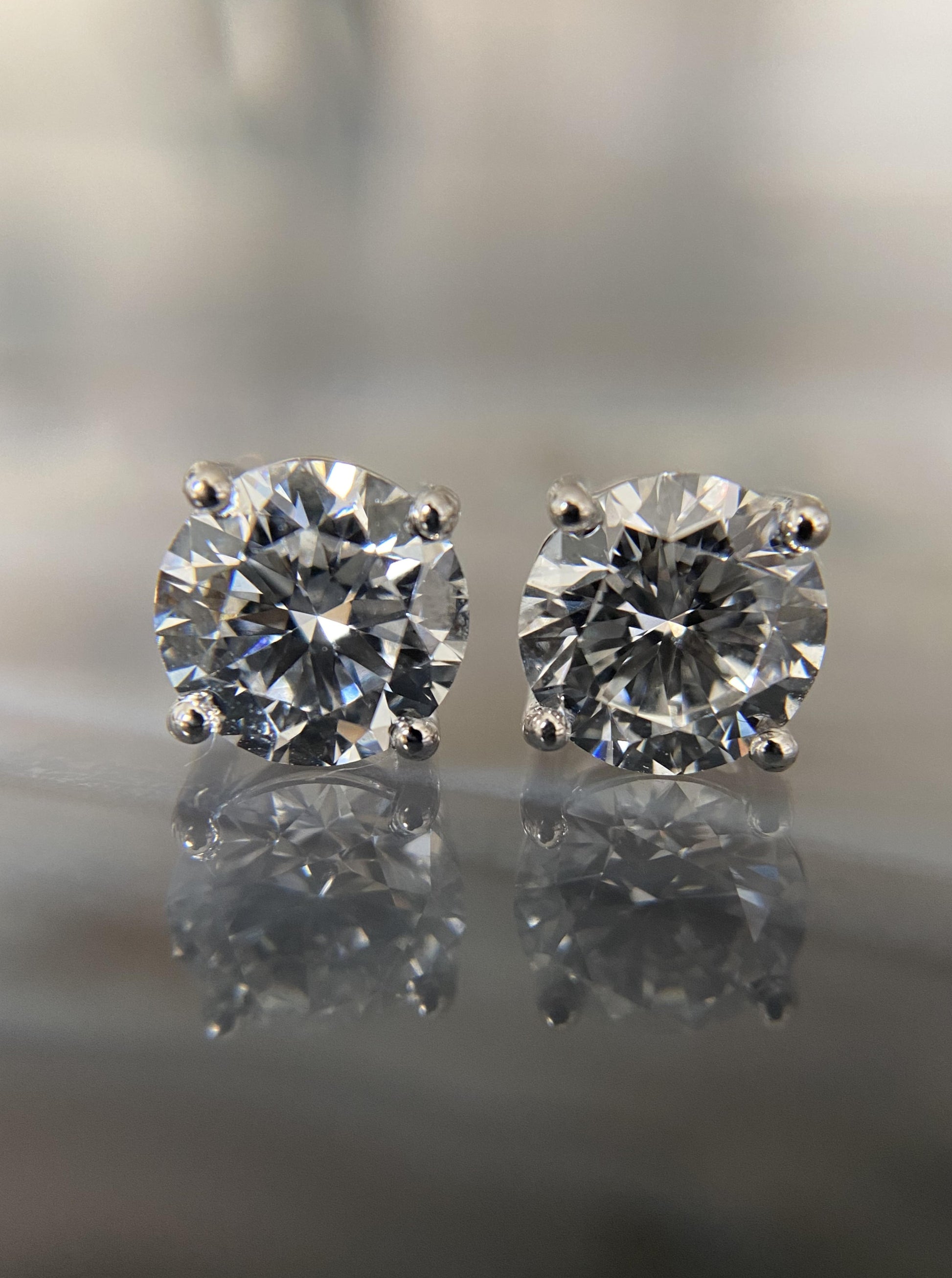 - Lab diamonds, total 2 carats (1 ct each stud), color F, eye clean.